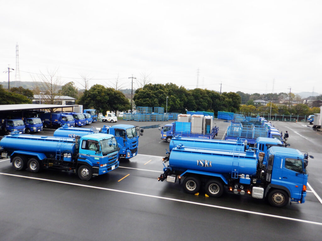 し尿の収集用に10トンバキューム車、2トンバキューム車、また資源物の収集用にパッカー車が駐車しています。